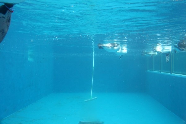越前松島水族館のフンボルトプール、ただ今掃除中。ジェンツーならモップに次々とアタック!するのでしょうが、ここのフンボルトたちは全く無視。水面でのんびりと羽づくろいをしています。