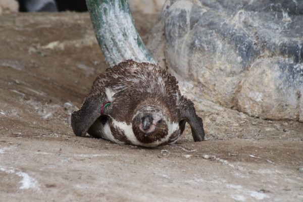 この個体はじっさいお年寄りで、群の中で最高齢ですが、羽のぼさぼさ状態は年齢のせいではなくて換羽が近いからです。1年使った古い羽が、伸びてくる新しい羽に押し出されるようにして抜けていきます。無事に換羽できるのは元気な印。ぼさぼさペンギンを見たら、応援いたしましょう。