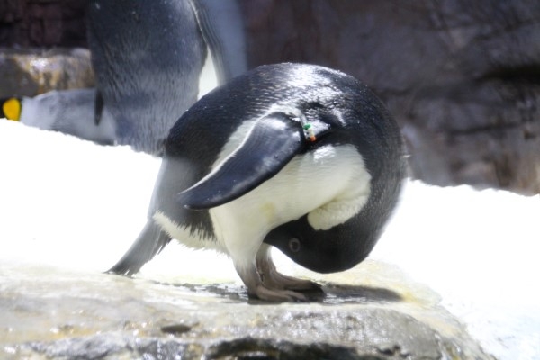 海遊館のアデリー、『ペンギンロール』を見事に決めました! 羽づくろいするこの姿勢、ロールケーキの断面みたいなので勝手にそう呼んでます。