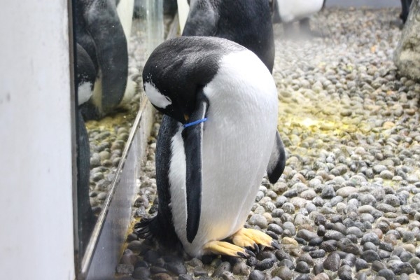 越前のジェンツー、お昼寝中です。前回写真のキングと同じ格好ですが、ちょっと首が短くてぎりぎりクチバシが届いているみたいな感じがします。クチバシを『脇の下』に挟むのは、クチバシから体温が逃げるのを防ぐためではと考えられています。