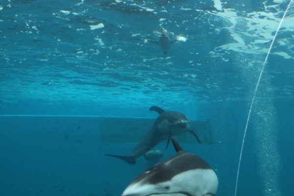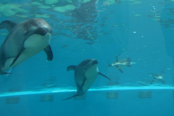 前にも紹介しました、のとじま水族館の大きな水槽で泳ぐフンボルトペンギンとカマイルカ。ペンギンは水面にいます。