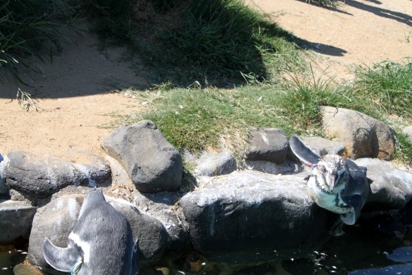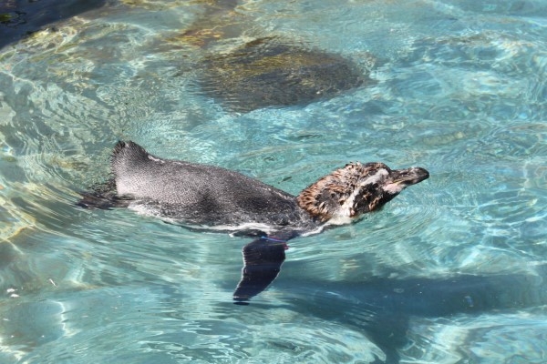 プールに落ちても大丈夫です。ご覧のように旧羽が残っているのは頭部だけなのですが、それでも気分がよくないのか、すぐに上陸していました。日本ではフンボルトペンギンの換羽は暑い時期にみられます。