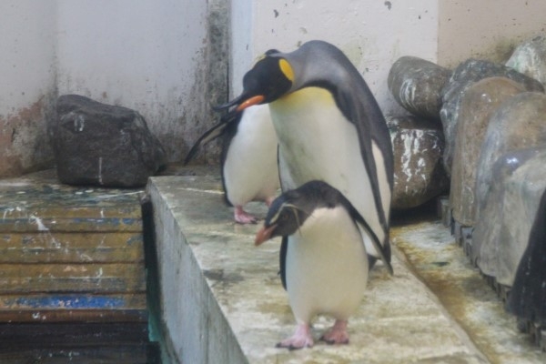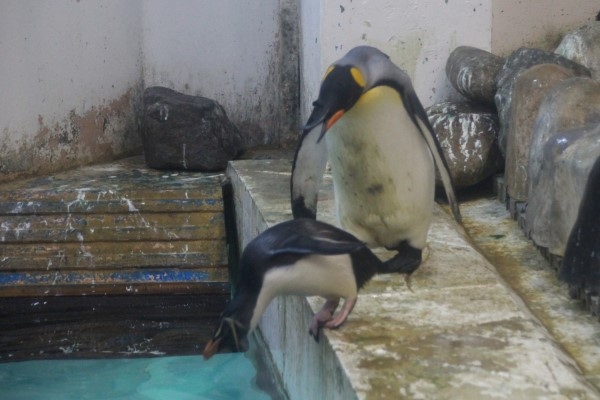 「よし行け!」と号令をかけているようなキング。飛び込んだのはイワトビだけでした。アドベンチャーワールドペンギン王国2階。