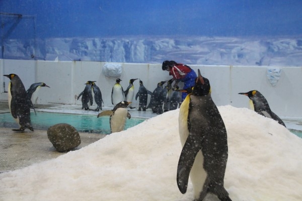 アドベンチャーワールドのペンギン王国、カキ氷の雪山に陣取るキング、順番待ち?で並ぶキング。雪山は人気のようですが。