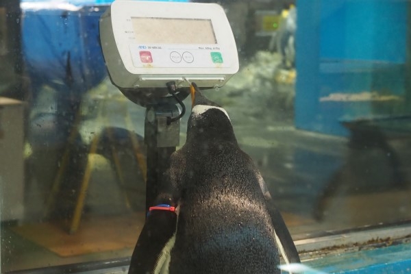 「あちゃ~っ」焦り顔で体重計から降りようとしている!みたいなジェンツー、どうだったのか気になっているような仲間ジェンツー。長崎ペンギン水族館の一角には、ペンギン用体重計が設置されています。