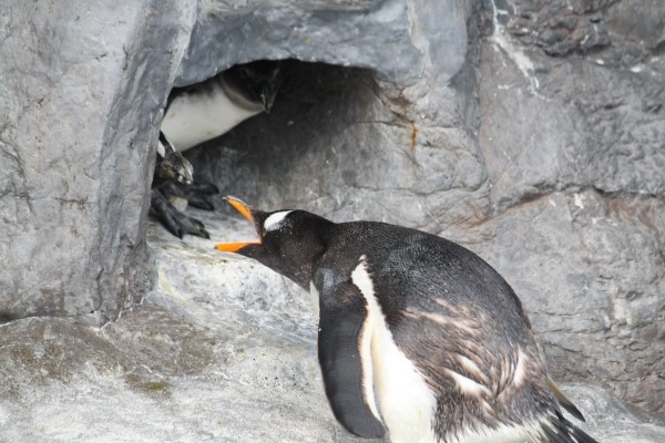 登別マリンパークニクスで、巣穴のケープ親子にケンカ訪問販売中のジェンツー。