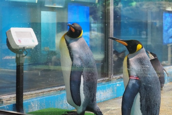 「数字出てないでこれ」 「さよか」 仲良し2羽の体重計遊びでした。長崎ペンギン水族館。