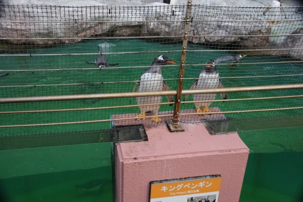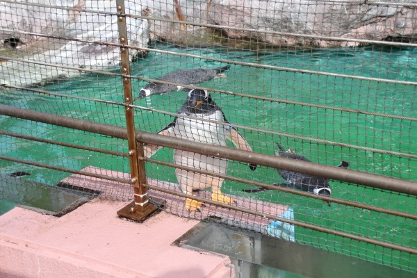 登別マリンパークニクスのペンギンプール、こんな所にジェンツーが上陸しています。プールのアクリルを支える柱の上。