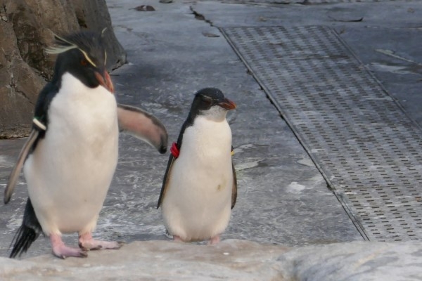 同じく葛西のイワトビ、奧は亜成鳥です。手前の成鳥と比べると、『眉』が薄い、ピンピンひらひらの飾り羽がない、顔の下半分が白い、のがよくわかります。ほわほわのヒナから変身した直後は『眉』はまったくなくて、だんだんと現れてきます。亜成鳥スタイルは次の換羽シーズンまでの期間限定です。