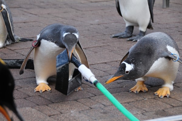登別のペンギンパレード、ジェンツーが広場で散水ホースを攻撃しています。好奇心旺盛のジェンツー、特に亜成鳥は突発的に面白いことをやってくれます。気をつけて見てましょう。