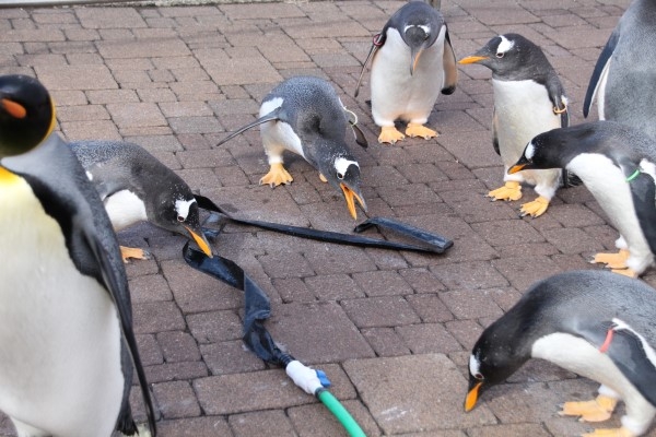 登別、広場の散水ホースがお気に召したジェンツー集団、参加者増えて、ずっとやってました。