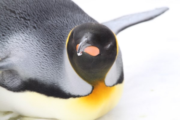 眼光鋭く胸のオレンジ色も鮮やかにポーズを決めるキングですが、クチバシ先端についた雪がゆるカワ効果に。ペンギンパレードをやってた頃の海遊館。