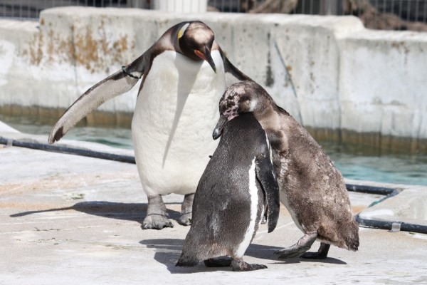 フンボルトの取り組みを裁くキング行司?! たぶんただの好奇心だと思いますけど、なんとも人っぽいペンギンたち。フンボルトの動作は求愛行動らしいですが、やってるのが御子様なので、遊びでしょう。名古屋東山動植物園の旧ペンギンプールでした。
