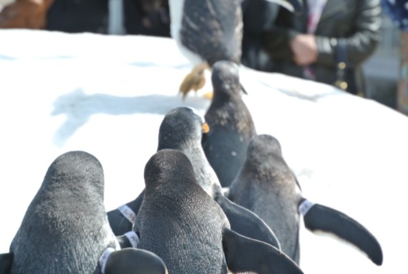 ジェンツー集団、雪山めがけて走ります。あまりに速いので、