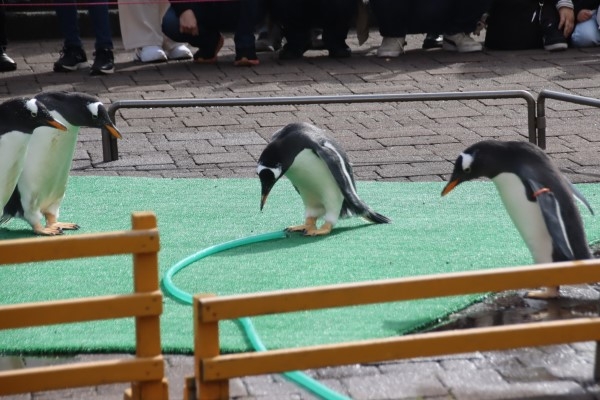 登別マリンパークニクスの名物ペンギンのお散歩。ちょうど広場に到着したところです。ペンギン囲いを閉じようとする飼育員さん。ところで、キングが踏んづけているホースは、先端に取り付けた簡易スプリンクラーで水をまくためのものです。