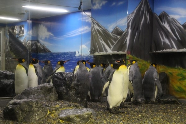 越前松島のキングは左手鏡前を陣地にしています。鏡に映って実際より多く見えますが、さて、実物は何羽いるでしょう。・・・8羽います。この時の飼育羽は9羽ですが、お年寄り1羽が別室に引き上げたところです。