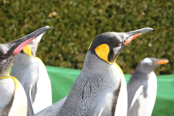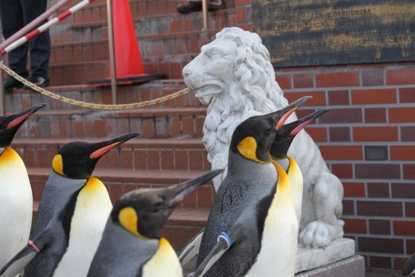 登別のキング集団、『ニクス城』の前を通過中。狛犬のようなライオン像がちょっとシュールな背景に。