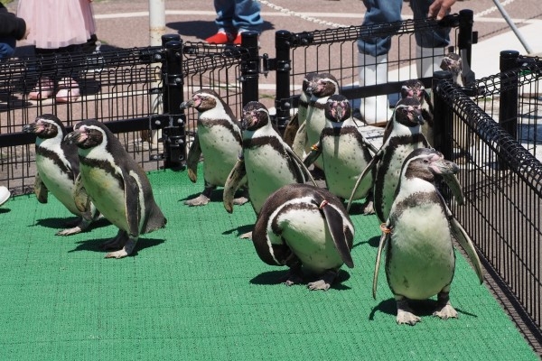 広場まで歩きます。越前松島水族館のペンギンのお散歩、フンボルトは通年、寒い時期はキングのお散歩もあります。