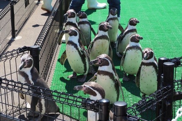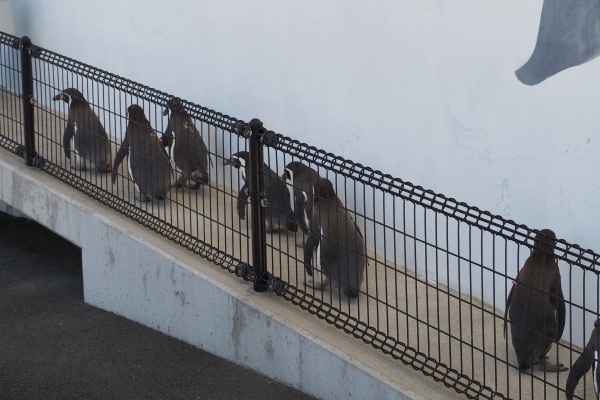 来た道を戻り、スロープを上がっていくフンボルトたち。ちょっと前かがみの姿勢が『お疲れ様』みたいに見えますが、じっさいは元気にスタスタと歩いてます。越前松島水族館のペンギン散歩でした。