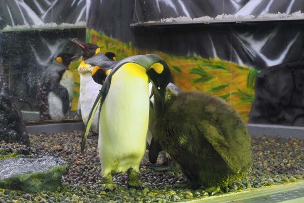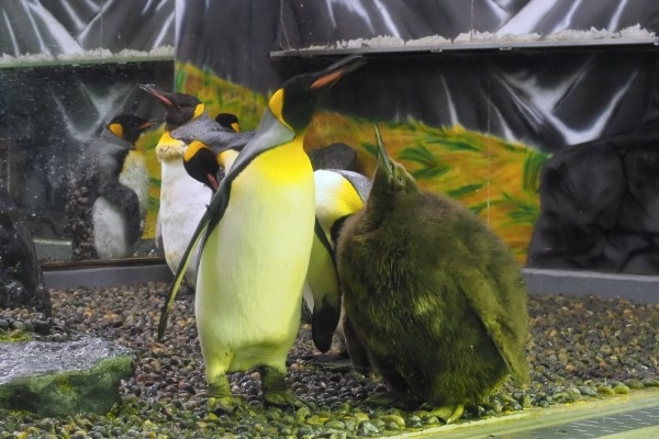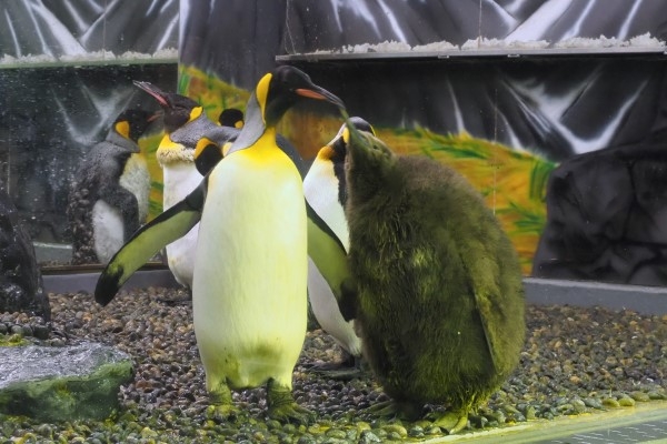 1回分おわると、口を離して上を向き、中身を胃に落としているかのような動作をします。このヒナは順調に育ち、立派な女子キングになってお嫁に行きました。越前松島水族館でした。