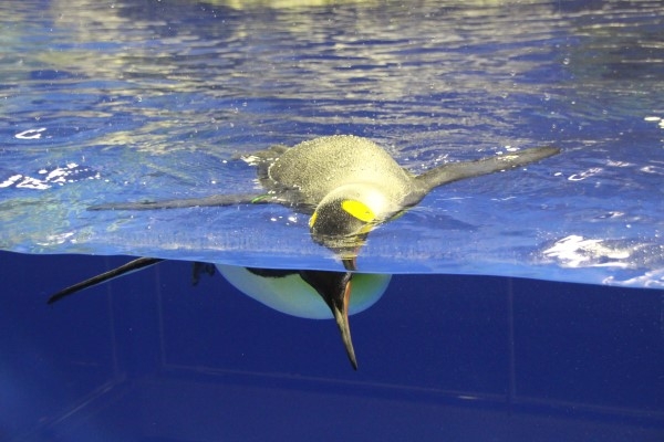水中部分が倍くらい太く見えているキングペンギン。水のマジックです。越前松島水族館。