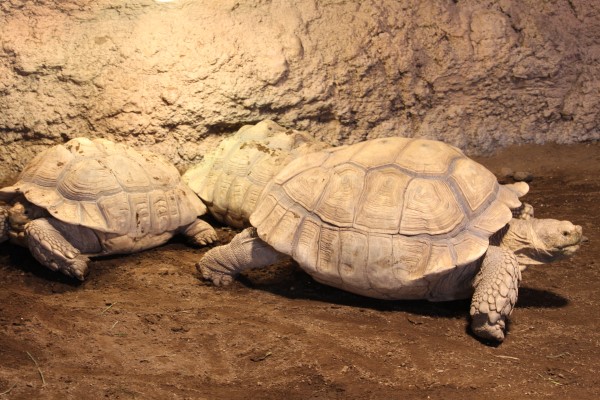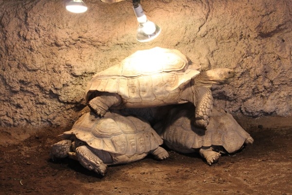小ガメの上に大ガメ載って~~。形の完成度は高いですが、下の小ガメたちが気の毒。大ガメ、保温ランプに近づきたかったのでしょうか。登別マリンパークニクスの陸族館。
