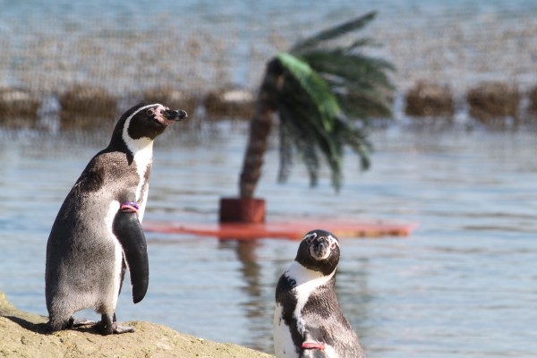 「ワテらとちゃいまっせ。」 「ほんまでっせ。」 バッキリと首が折れた、残念なヤシ(たぶん模造)。もちろん、やったのはペンギンではなくて風です。昔、長崎ペンギン水族館ふれあいビーチにて。