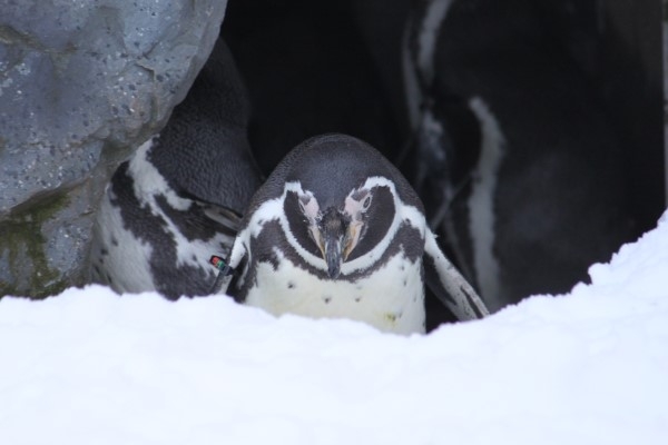 旭山のフンボルト、雪の積もった屋外に出ようかどうしようかと考えているふう。フンボルトペンギンは温帯に棲息する種ですが、これくらいの寒さは大丈夫。