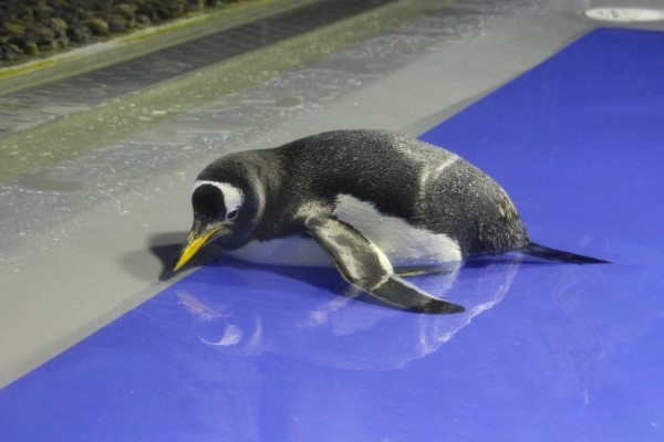 プールの浅瀬に寝転がって、おなかを水につけているジェンツー。現場では「あれなにやってるの?」と聞こえてきます。ハラ側の半身浴? 水に映る自分を見ている? 飼育員さんの見解は「遊んでいる」でした。越前松島水族館。