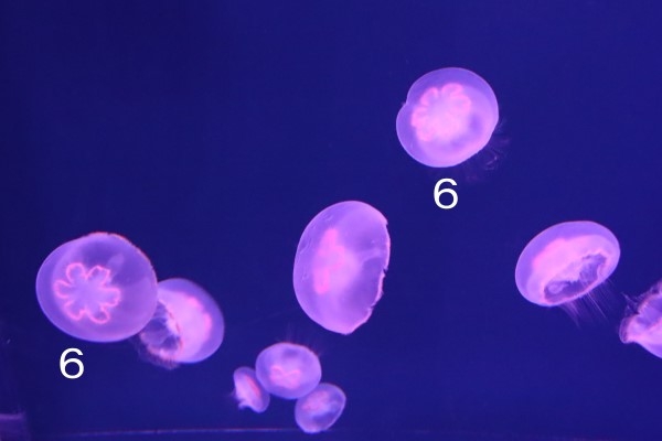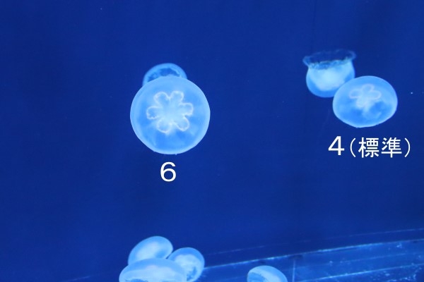 登別マリンパークニクスのミズクラゲ、色の変わるライティングで幻想的な展示風景です。さて、ミズクラゲは『カサ』の中に透けて見える生殖腺が四つ葉型になっているため、四ツ目クラゲとも呼ばれるそうです。が、四ツ目じゃないヤツもいます。写真は標準的な個体と『六つ目』になっている個体。
