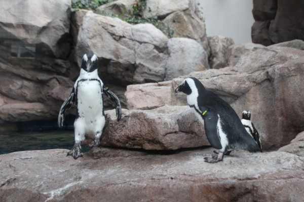 岩の段差を飛び降りるケープ。それを見ている仲間。飛び降りケープの『太もも』がむっちりしています。じつは、この部分は脛(すね)、膝から下の部分です。人間の太ももにあたる部分は外からは見えません。@京都水族館2025/07/14