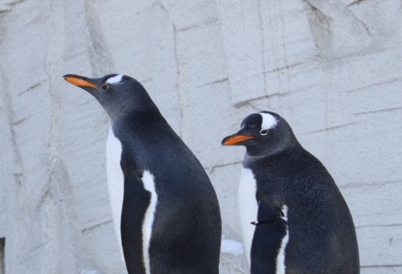 涼しげな写真を。冬の旭山、ジェンツーが2羽、プールの島に登っています。前にいるのは亜成鳥。
