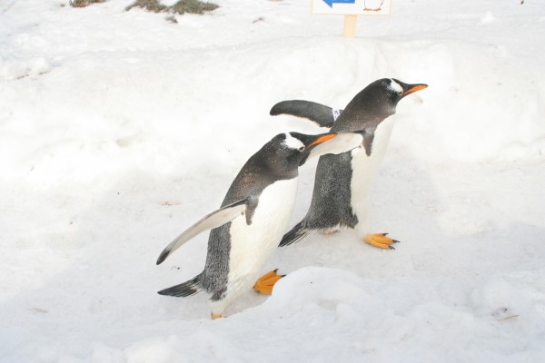 おたる水族館冬季限定ジェンツーのお散歩。広場の散歩コースは、画面上に見えている矢印の向き(左)に順路が決まっております。でも気にしないペンギンたち。もしかしたら、よく練られた演出かも?