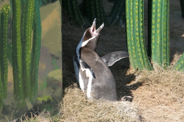 サボテンの荒野で独り雄叫びを上げるふうフンボルトの図。越前松島水族館の旧フンボルトプールでした。