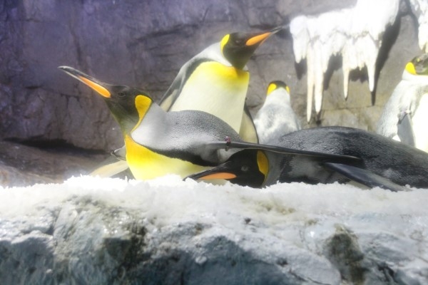 海遊館のキング、仲良し2羽です。奧がカレ君、手前がカノジョさん。カレ君が寝転がるときに、フリッパーがカノジョさんの上にのっかってしまいました。仲がいいと、これくらいヘーキです。仲の悪い個体どうしだと、近くを通りかかっただけで「やんのかコラッ」の雰囲気をだしたりすることが。