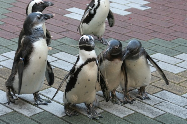 「なにそれー?」 「ええなーそれー」 ケープの亜成鳥がうらやましげに見ているのは、成鳥が運んでいる枯れ草。オトナには巣材ですが、亜成鳥にとってはオモチャかも。アドベンチャーワールドのペンギンパレードでの一コマ。