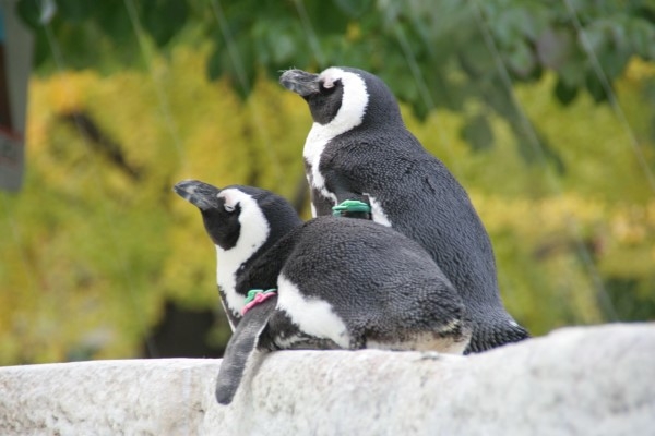 黄葉を背景に、ペアでくつろぐケープペンギン。上野動物園。