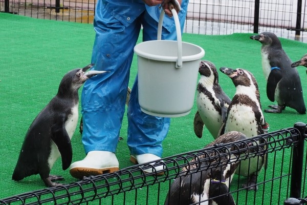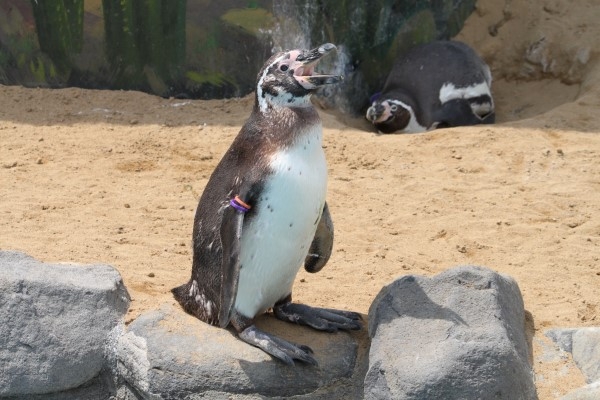 手前にいるのはフンボルト亜成鳥、つまり御子様です。なので身体にはトレードマークの一本線がまだありません。でも顔の模様はオトナと似ていて、私は期間限定のこの『老け顔』を楽しんでいます。