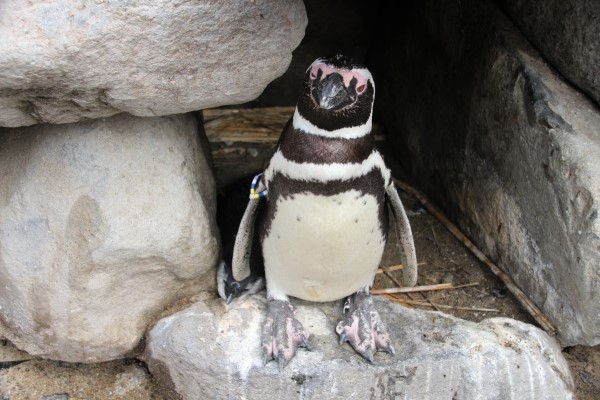 しばらく離れていて戻ってみたら、お父さんが立ち上がってました。巣穴ごとヒナを守っています。よく見ると、