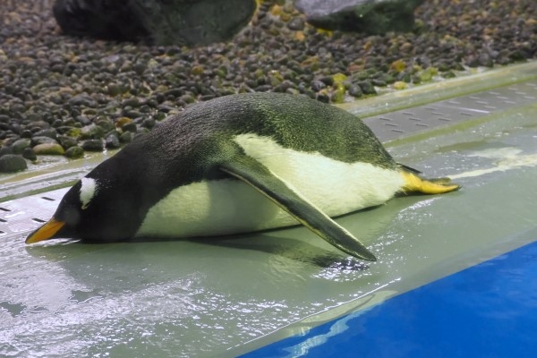 ジェンツー行き倒れか?!と心配になりますが、お昼寝です。フリッパーが浮いているので、力は入っているようです。越前松島水族館。