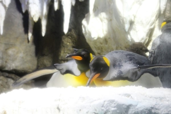 今度はカノジョさんがフリッパーをカレシ君の背中に回して、ぐいっと。「んっ、なんだ?」っていう感じのカレシ君の表情が人っぽく見えるのは、ペンギン中毒者だから? 海遊館の仲良しキング、次回完結。