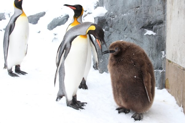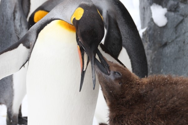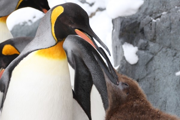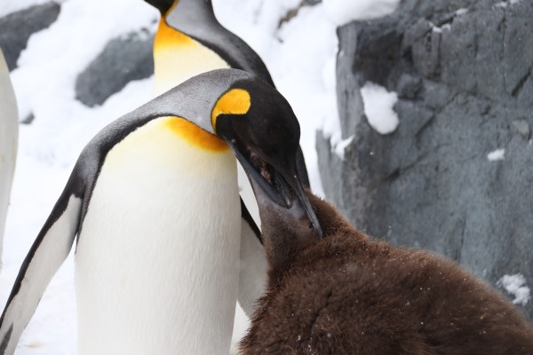 お母さんは首を上げます。ヒナちゃんはまだまだ食べたりないみたいで、お母さんのクチバシにタッチして催促します。