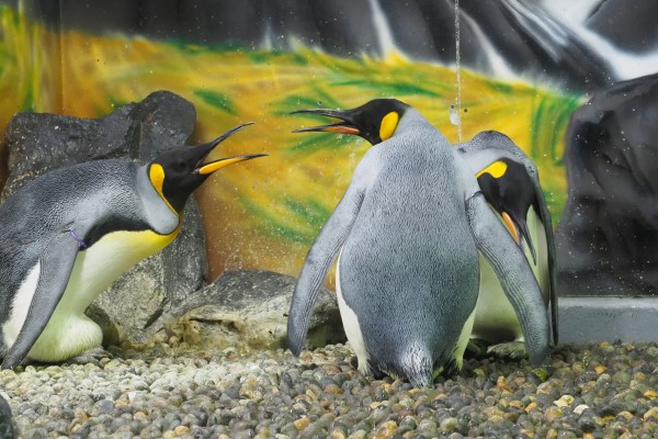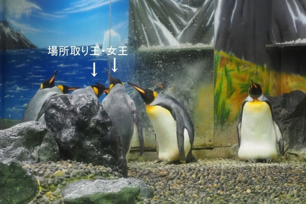 場所取り王ペア、今度は回り込んで抱卵女王に直接攻撃をかけます(右の2羽)。卵を足の上に載せたまま迎え撃つ抱卵女王。お互いに鋭いクチバシを向け、時々すごい勢いでくり出しますが、威嚇なので、相手に当たることは滅多にないようです。