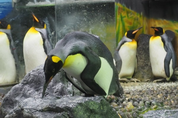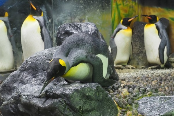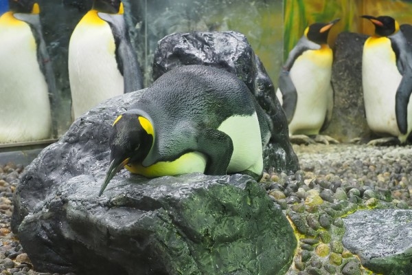 キング2ペアの場所取り攻防戦が終わり、他のペンギンに目を移してみると、若いキングが岩組みで寝ころぼうとしています。慎重に上体を倒し、ハラが接地する寸前でホールドしたまま考え込んでいます。