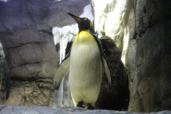 キングのヒナちゃん、お父さんと一緒。お父さんは、ヒナに興味津々な他のキングから我が子を護っています。写真の左端にチラリと見えているのは、接近チャンスをうかがう他人キング。海遊館、3年くらい前の様子です。
