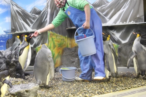 前回のコガタペンギンと比べてみましょう。こちらはキングのお食事風景。越前松島です。飼育員さんの足元にある小さな方のバケツが、前回写真のバケツと同じくらいかと思います。キングの体重は10-15キロ、個体や季節差がありますが。