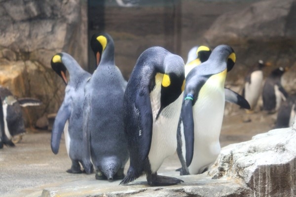 長崎ペンギン水族館のキング、グループでそろって羽繕いしてます。念入りに羽繕いしたあとは、お昼寝することが多いようです。