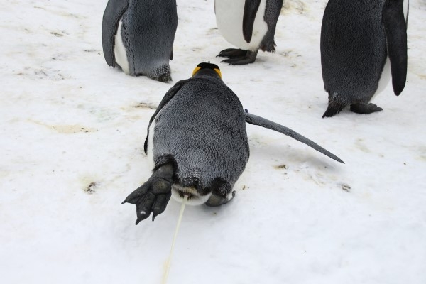 ペンギンも鳥ですから、排泄は鳥フン。ためておく機能がないため、いつでもどこでも、です。しかもかなり勢いがあります。このキングペンギン、現場は旭山動物園。鳥フンの内訳は、液状なのが尿、そこに混じっている固形状なのが便です。出口は『総排泄孔』と呼ばれ、メスなら卵もここから出ます。
