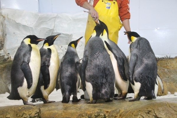 アドベンチャーワールド王様皇帝様のランチタイム。キングは左から3羽目です。