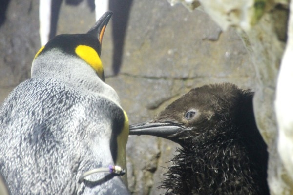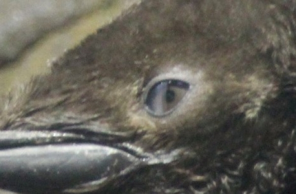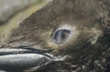 前回と同じ、お母さんといっしょに過ごす海遊館のキングのヒナ。ちょっとその目に注意してみましょう。目頭側が白っぽいのは、反射ではありません。拡大すると粗くなってしまいますが、